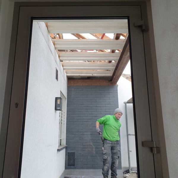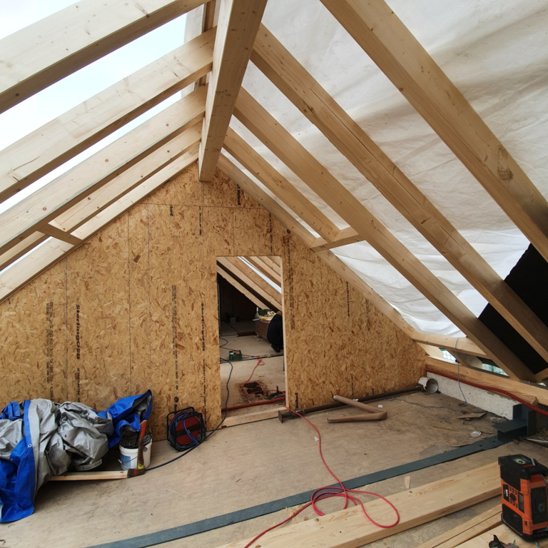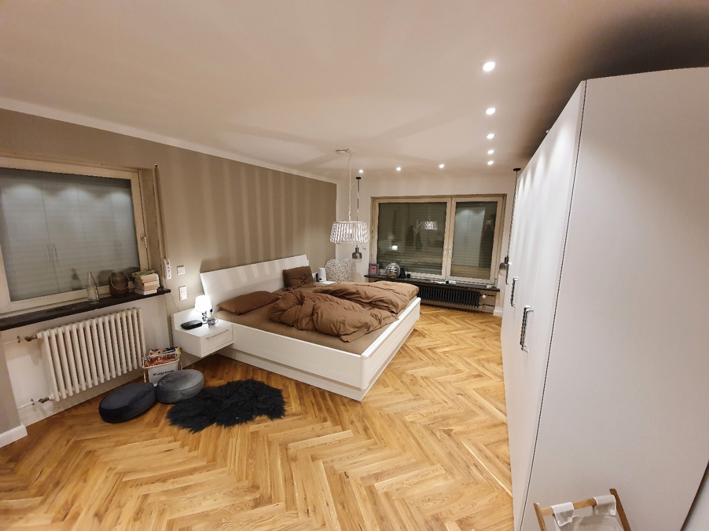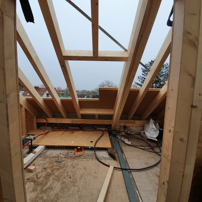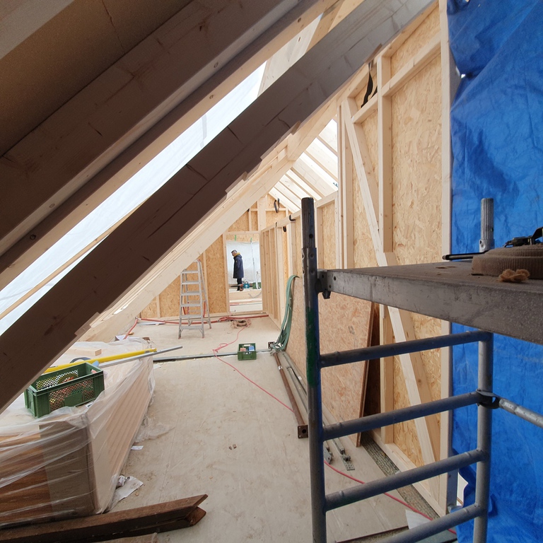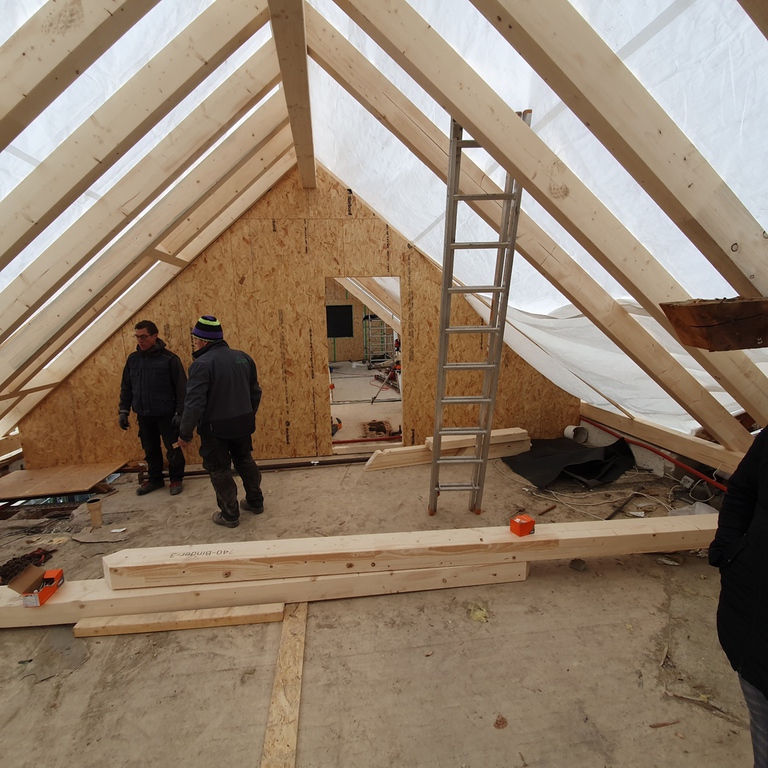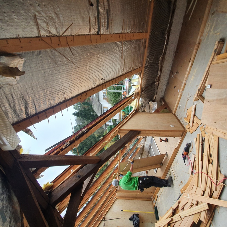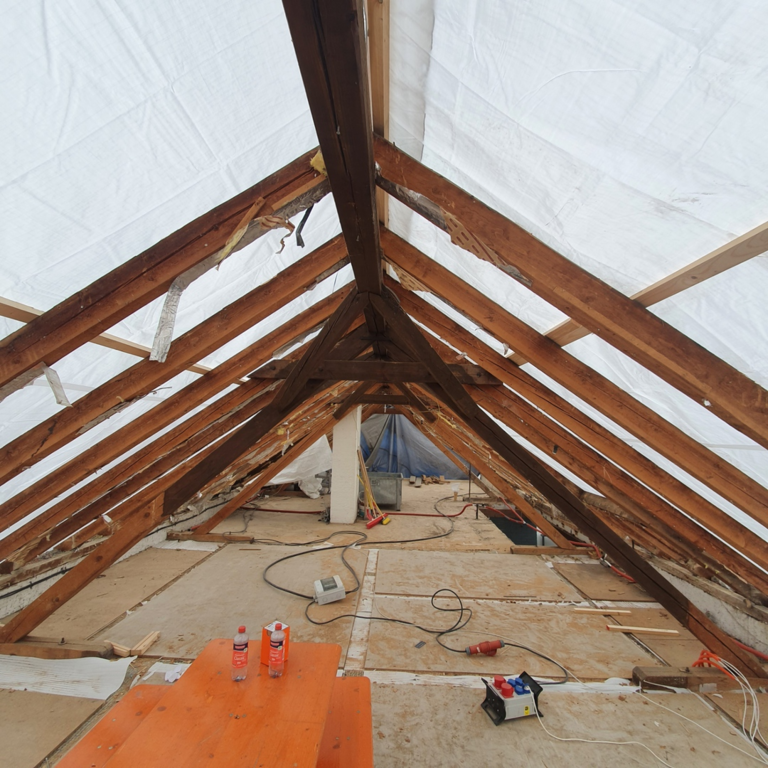 Umwandlung ehemaliges Kachelofenzimmer in neues Schlafzimmer, unter der abgehängten Decke kommt das ehemalige Dach des Hauses zum Vorschein